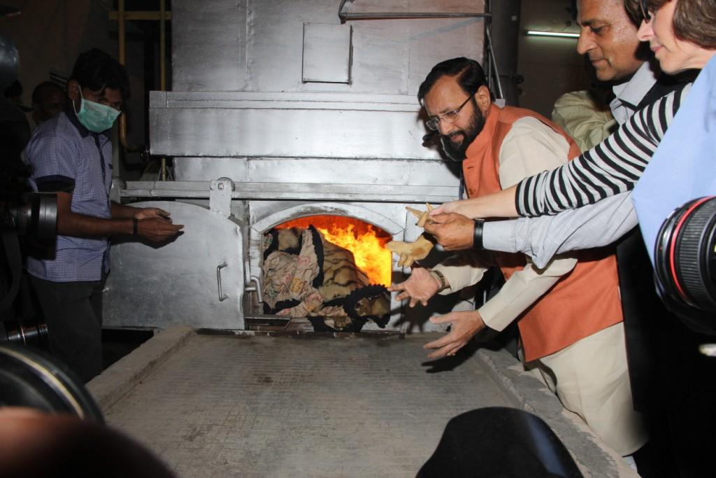 | Minister Prakash Javadekar and other MoEF officials burning illegal wildlife products in the Delhi Zoo. |