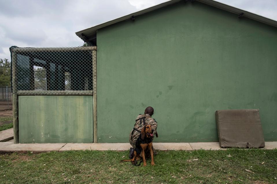 | A tracker dog and its handler at the Kruger National Park K-9 Center. |