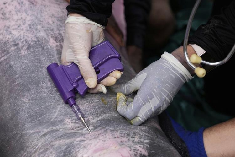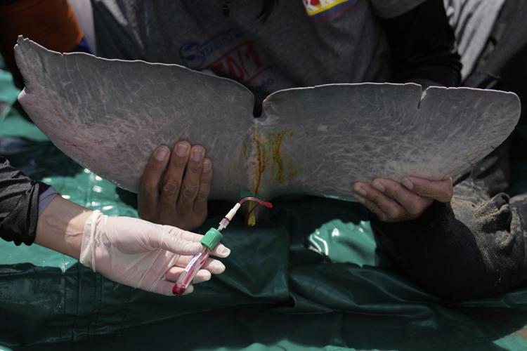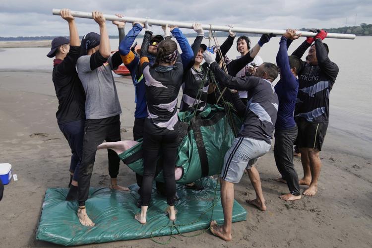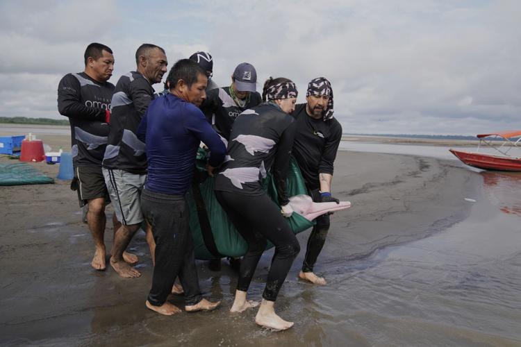 Fishermen help scientists and veternarians capture Amazon river dolphins for health checks |